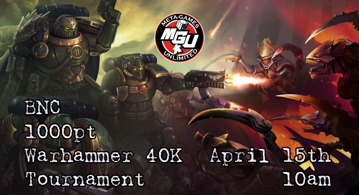 1000 point Warhammer 40,000 tournament.$10 EntryMissions: TBA Sign in at… |